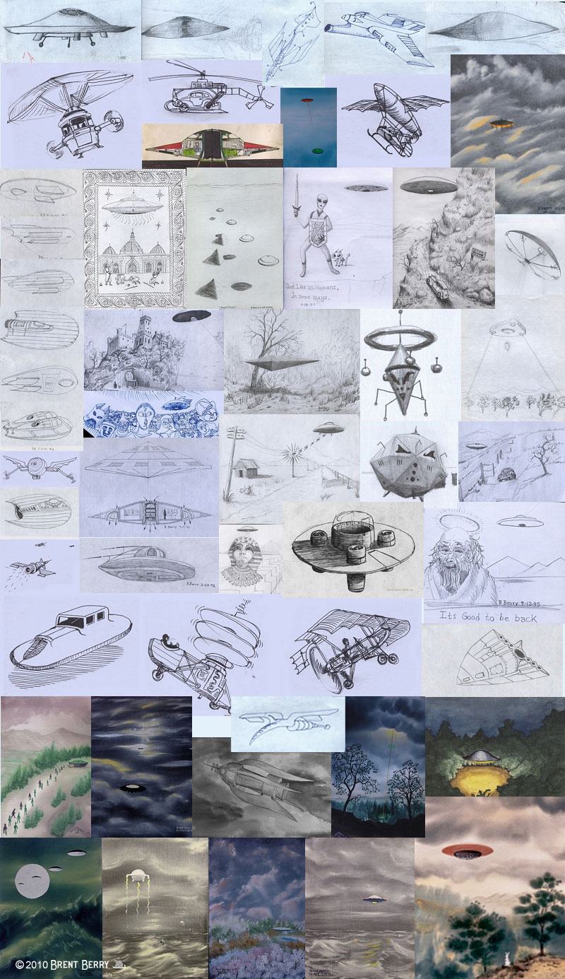 |  | UFO IMAGES- UFO ART - ALIEN ART   UFO digital art - UFO Paintings - UFO Drawings - UFO Metal Art - Alien Art - Dyslexic Art  These are just for fun. I'm not claiming they're real ufo photos.  I've been fascinated by the subject of ufos since I was a kid after learning that my mother and grandparents witnessed a UFO in southern Colorado in the late 1940s.  Even though I've never witnessed one with my own eyes, members of my family have.   Knowing that and knowing that we here on earth are not alone inspires me to do these images. It's an expression of my curiosity. DIGITAL UFO ART  My ufo art is featured in the book "Art of Close Encounters" by Kim Carlsberg.  A high quality 350 page book featuring art and stories related to close encounters.  The book has received glowing reviews by many including George Noory of Coast to Coast radio. UFO PAINTINGS and REPOUSSE  These are some ufo things I did using watercolors and Brass repousse.  These are all pieces from the 90's.    A Gift Painted on Slate  UFOs and Flying Machines Drawings and Paintings from my younger days, 1990s and earlier.     Do you like Mysteries? Supernatural? Paranormal? the Unexplained?  Listen to Coast to Coast AM radio program with George Noory, Ian Punnett and Art Bell.  NIGHTTIME RADIO AT IT'S BEST! Lots of interesting discussion happening here!! An excellent UFO sight that offers over 1500 of the best ufo photos in the world!  Check it out!  UNITED KINGDOM UFO GROUP  The latest UK, International UFO news, sightings, photos, links and more! Latest ufo sightings world All images on this website are copyrighted property of Brent Berry & brentberryarts.com 2004 - 2024 Please ask me before you use my images.  |  |