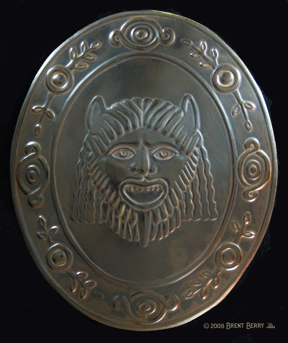 A brass repousse of a Greek Satyr (600 BC). Hand embossed brass but the chemicals I used to tarnish it made it look like old silver.